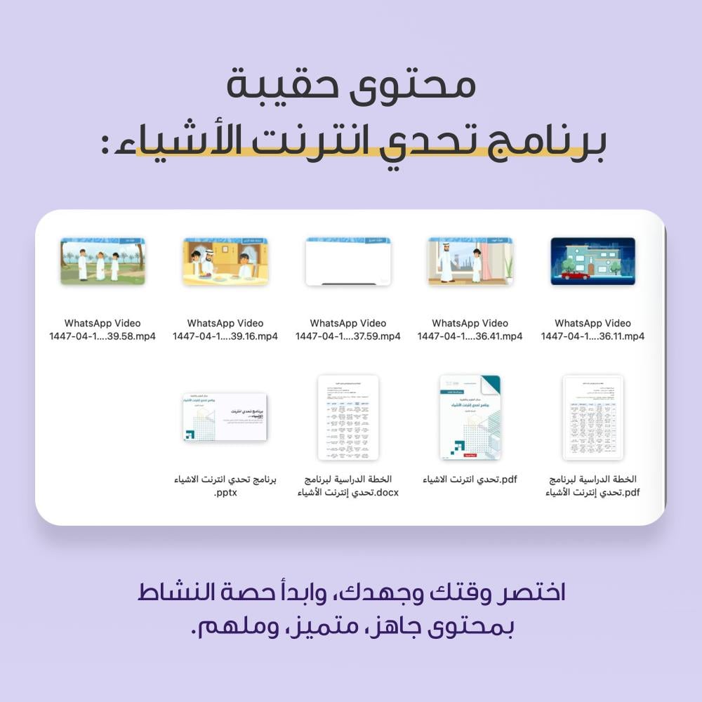 💡 حقيبة برنامج تحدي إنترنت الأشياء صُممت خصيصًا لطلاب المرحلة الثانوية لتطوير مهارات التفكير الابتكاري، وفهم تطبيقات التقنية الحديثة في حياتنا اليومية ضمن إطار برامج النشاط الطلابي.
