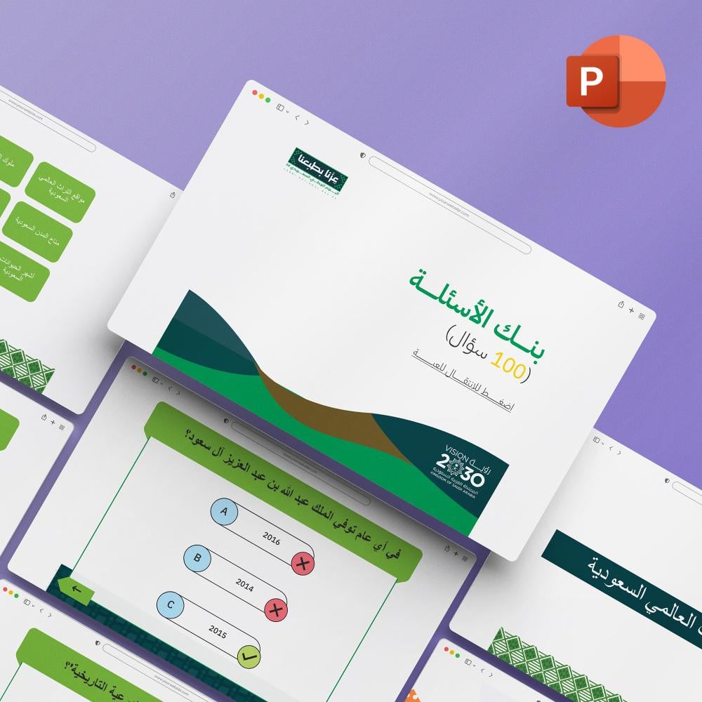 احتفل باليوم الوطني السعودي الـ95 بطريقة تفاعلية وممتعة مع منتجنا الرقمي "بنك الأسئلة - 100 سؤال". يتضمن هذا العرض التقديمي التفاعلي مجموعة متنوعة من الأسئلة التي تختبر معلوماتك حول المملكة العربية السعودية. مثالي للمدارس، الأنشطة الترفيهية، والتجمعات الوطنية.