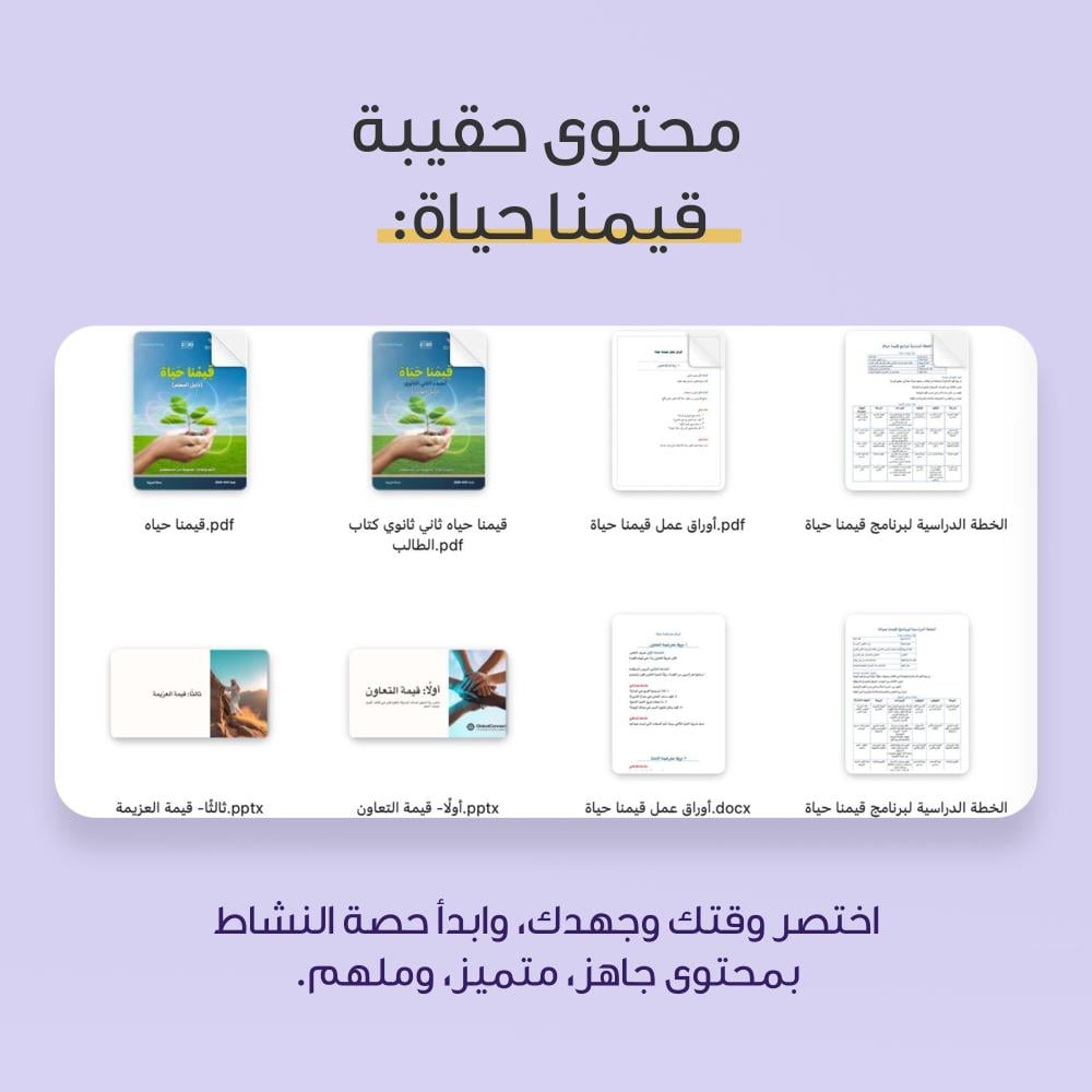 حقيبة برنامج قيمنا حياة تحتوي على 4 عروض تقديمية وأوراق عمل جاهزة، تهدف إلى ترسيخ القيم الأخلاقية والسلوكية الإيجابية في البيئة المدرسية، وتعزيز الانتماء والمواطنة الفاعلة ضمن إطار برامج النشاط الطلابي.
